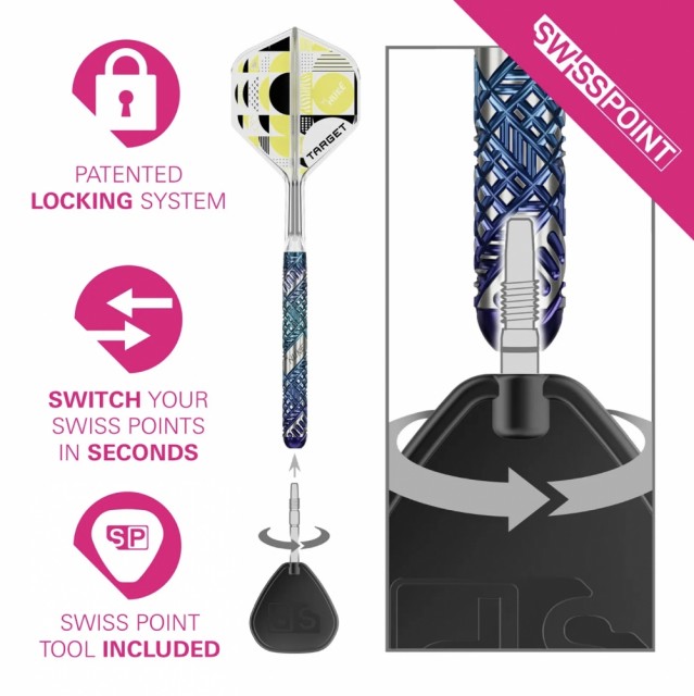 Pilene leveres med 30 mm Swiss Fire Points forhåndsmontert samt et ekstra sett 42 mm spisser for personlig tilpasning. Med Targets patenterte Swiss Point-system kan spissene enkelt byttes på få sekunder ved hjelp av den medfølgende Swiss Point-nøkkelringen.