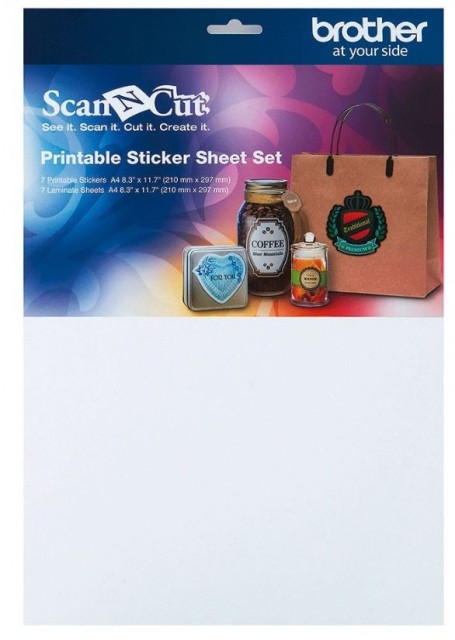 Pakken inkluderer: 7 ark med utskrivbare klistremerker og 7 ark laminat. For bruk med Brother ScanNCut Kit for utskrivbare klistremerker.