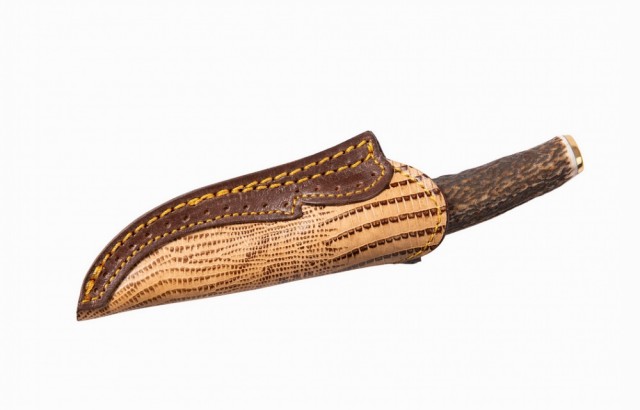 Bladet er smidd i ekte rustfritt Damaskusstål, kjent for sin utrolige styrke, varige skarphet og det karakteristiske bølgemønsteret som gjør hver kniv unik. Håndtaket er laget av autentisk hjortehorn, kombinert med messingdetaljer som gir et eksklusivt og tidløst uttrykk.