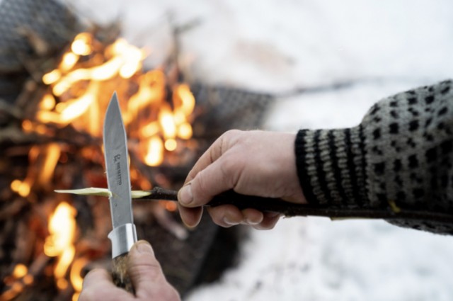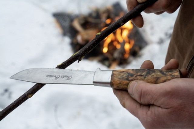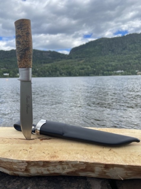 Bladet er laget av Sandvik Stål, som er kjent for sin holdbarhet og enkel sliping. Skaftet er laget av nøye behandlet masurbjørk, noe som gir både et vakkert og funksjonelt grep. Kniven leveres med en stilfull lærslire for sikker oppbevaring og enkel tilgang.