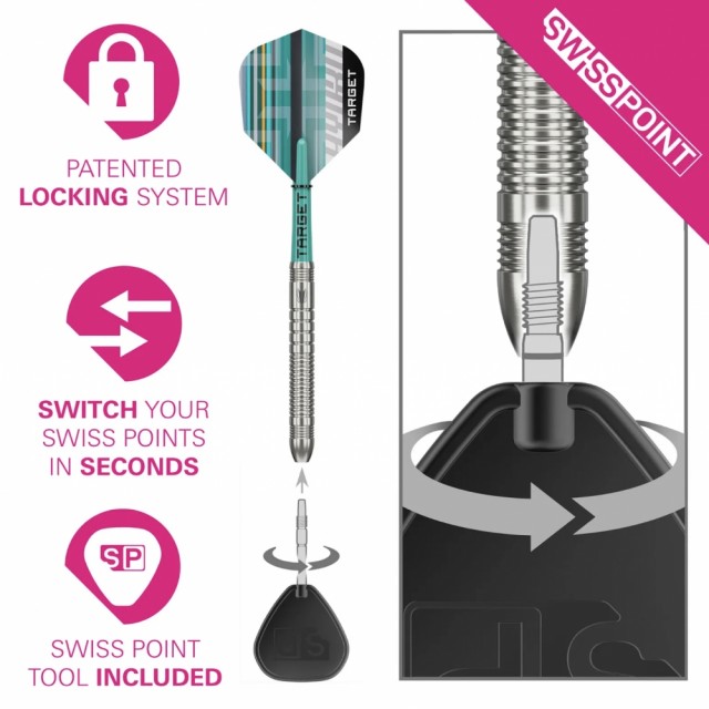 Hver pil leveres med glatte sølvfargede Swiss Points og en sømløs nose-profil som reduserer bounce-outs og gir bedre feste i tavlen. Med Swiss Point-systemet kan du bytte spisser på sekunder ved hjelp av det medfølgende SP-verktøyet, mens taper-og-gjenge-teknologien sørger for at spissene alltid sitter låst og sikkert.