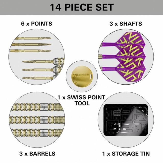 G1 Prodigy-pil settet med stål spiss inkluderer Targets Swiss DX-spisser, designet for å sitte i flukt med løpet, med et laseretset design for ekstra fingergrep og sikker inngang til dart skiven. Swiss Points er designet med en patentert låsemekanisme, som muliggjør enkel bytte av pilspisser. Konisk og gjenge teknologi gir en sikker og låst posisjon, og gir stabilitet og presisjon under hvert kast. Velg mellom to spiss lengder – 26 mm og 30 mm; bruk det medfølgende premium gullfargede Swiss Point-nøkkel verktøyet for å tilpasse pil oppsettet.