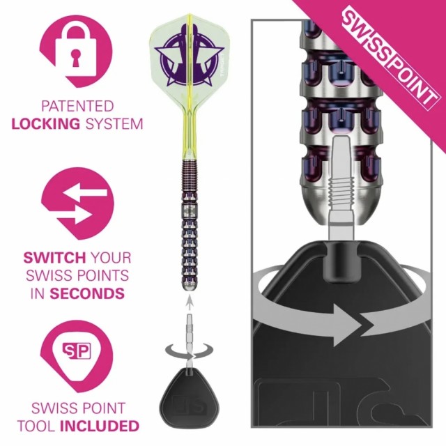 Med Swiss Point-teknologien kan spissene enkelt byttes på få sekunder. Settet inneholder både 35 mm og 42 mm spisser, slik at du kan tilpasse oppsettet etter spillestil. Et premium Swiss Point-verktøy følger også med for raske justeringer.