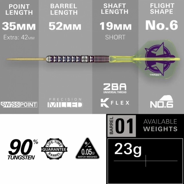 Denne spesialutgaven er basert på Lukes velprøvde Target-design og er utviklet for maksimal presisjon, kontroll og ytelse. Barrelene er presisjonsfrest og utstyrt med Targets Pixel Grip-teknologi, som gir overlegent grep og stabil release. Den slanke 6,5 mm profilen gjør det enklere å samle pilene tett i treblesonen og oppnå høyere scoring.