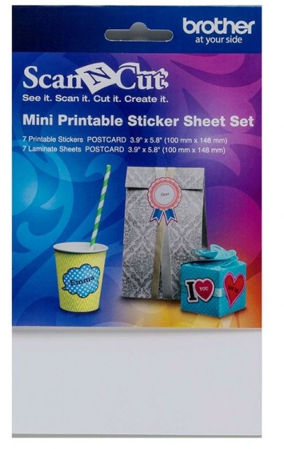 Pakken inkluderer: 7 ark med utskrivbare klistremerker og 7 ark laminat. For bruk med Brother ScanNCut Kit for utskrivbare klistremerker.