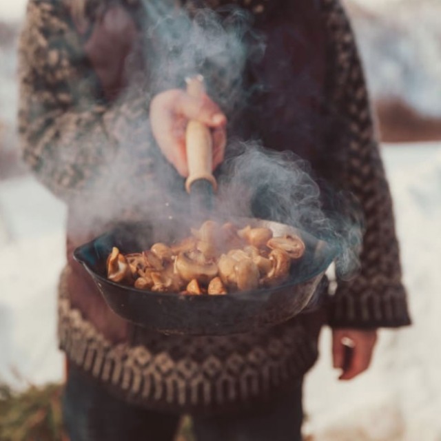 Espegard steikepanne. Her lukter det egg og bacon, små pannekaker og fersk ørret som krøller seg i panna. Praktisk støpejernspanne med ekstra langt skaft av tre, til bruk på bål og bålpanne. Liten nok til puttes i tursekken. Opphengskrok i enden av skaftet. Bruk godt med smør eller olje ved steiking. Settes inn med et tynt lag matolje etter bruk og lagres tørt.