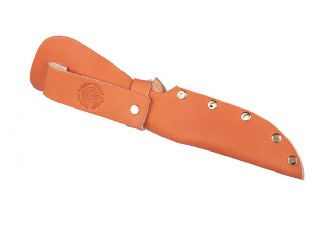 Kniven leveres med en håndsydd slire i ekte lær, som beskytter bladet og gjør det enkelt å bære kniven trygt med seg – enten i beltet eller i sekken.